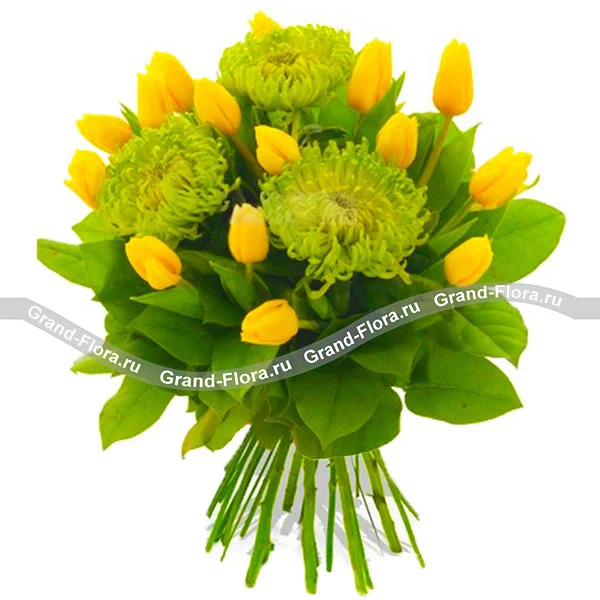 Оригинальная композиция на основе хризантем Шамрок, тугих бутонов желтого тюльпана и листьев салала станет прекрасным подарком для колоритной, противоречивой натуры. К Вашим услугам - доставка цветов в любой город России и СНГ!