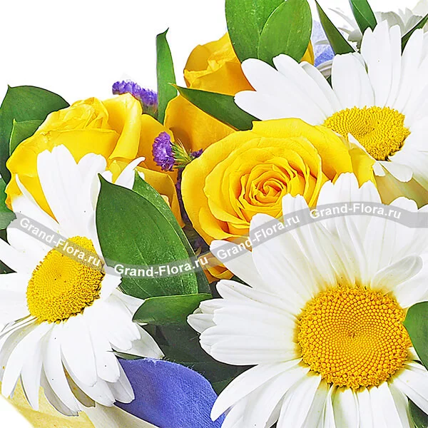 ЛЮКС: ромашка белая - 11 шт, роза желтая - 10 шт, статица - 5 шт, рускус, фетр желтый, бант фиолетовый.