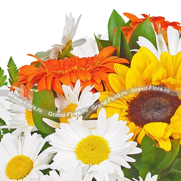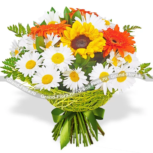 Стандартный (на фото): ромашка белая - 15 шт, гербера оранжевая - 3 шт, подсолнух - 1 шт, рускус, папоротник - 5 шт, сетка зеленая.