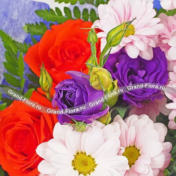 Стандартный (на фото): роза красная - 3 шт., хризантема кустовая  светло фиолетовая - 2 шт., эустома фиолетовая - 2 шт., папоротник - 5 шт., фетр синий, бант красный.
