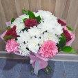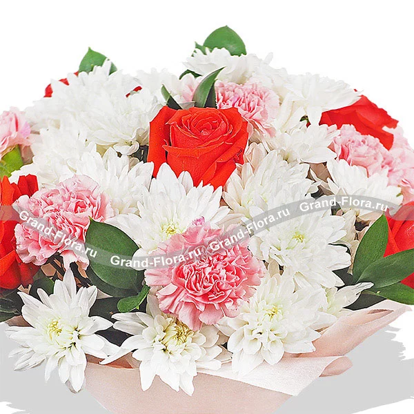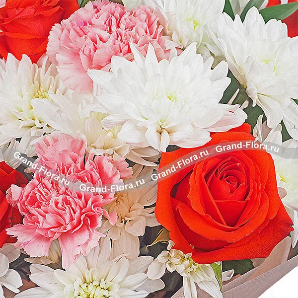 Уменьшенный: роза красная - 3 шт., гвоздика розовая - 4 шт., хризантема кустовая белая - 3 шт., рускус, фетр розовый. Примерный объем букета 25х25 см.