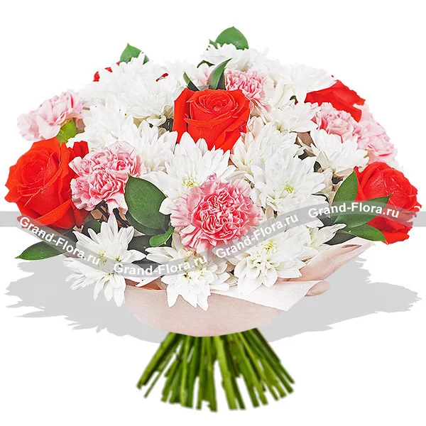 ДЕЛЮКС: роза красная - 15 шт., гвоздика розовая - 16 шт., хризантема кустовая белая - 10 шт., рускус, фетр розовый. Примерный объем букета 40 и более см.Нежнейший букет собран из утонченных кустовых белых хризантем. Выразительности композиции придают огненные красные розы и деликатные розовые гвоздики. Довершает цветочное сочетание рускус и умело подобранная упаковка. Очаровательный букет станет безупречным решением для вручения маме в день ее рождения. Кроме того, столь роскошная композиция поможет пленить сердце девушки, завоевав его навсегда.