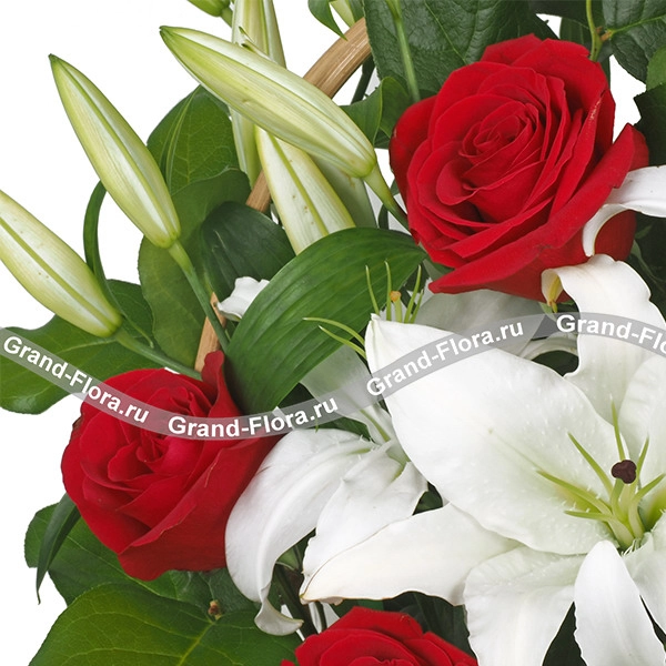 Стандартный (на фото): роза красная (50 см) - 9 шт., лилия белая - 2 шт., рускус, оазис, корзина.