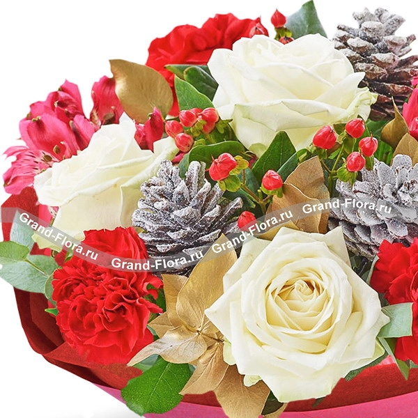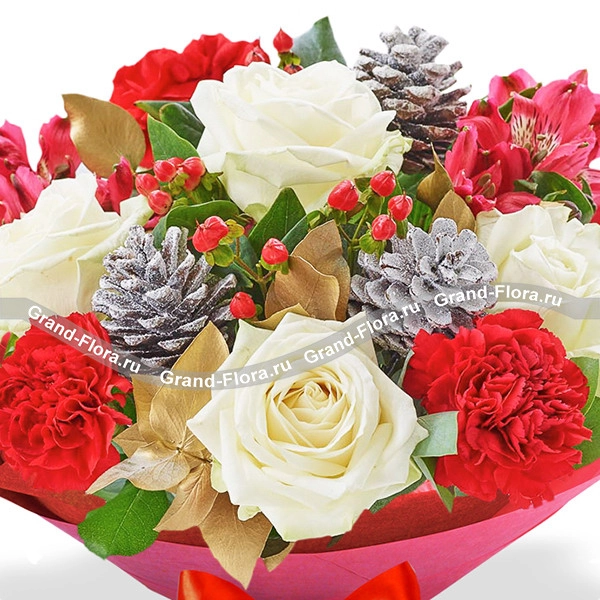 Стандартный: роза белая - 5 шт., гвоздика красная - 3 шт., гиперикум - 2 шт., альстромерия красная - 3 шт., шишки - 2 шт., эвкалипт  - 2 шт., фетр розовый, бант красный, шоколадка Dove в подарок.