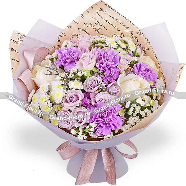 Стандартный: роза белая - 2 шт., роза кустовая фиолетовая - 1 шт., гвоздика фиолетовая - 2 шт., хризантема сантини - 2 шт., хризантема кустовая ромашковая фиолетовая - 2 шт., статица, упаковка, лента. Примерный размер: 30Х30 см.