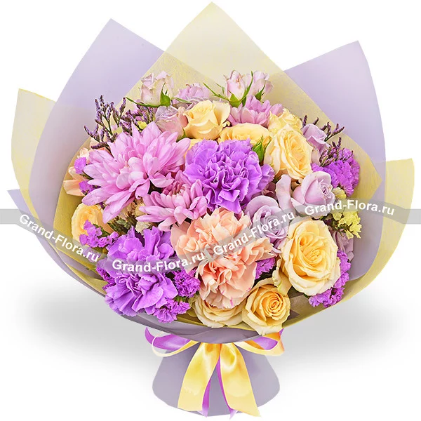 Люкс: гвоздика фиолетовая - 3 шт., гвоздика персиковая - 4 шт., хризантема кустовая ромашковая фиолетовая - 3 шт., кустовая роза желтая - 3 шт., кустовая роза фиолетовая - 2 шт., статица, лимониум, упаковка, лента. Примерный размер: 40Х40 см.