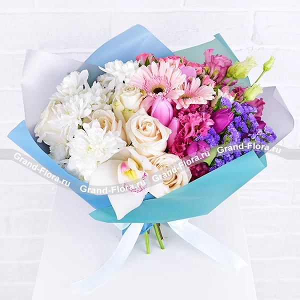 Стандартный: орхидея белая - 1 шт., гербера розовая - 1 шт., роза белая - 2 шт., хризантема кустовая белая - 2 шт., эустома розовая - 2 шт., роза кустовая розовая - 2 шт., тюльпан розовый - 1 шт., тюльпан фиолетовый - 2 шт., статица, упаковка, лента.Примерный размер: 30Х30 см.