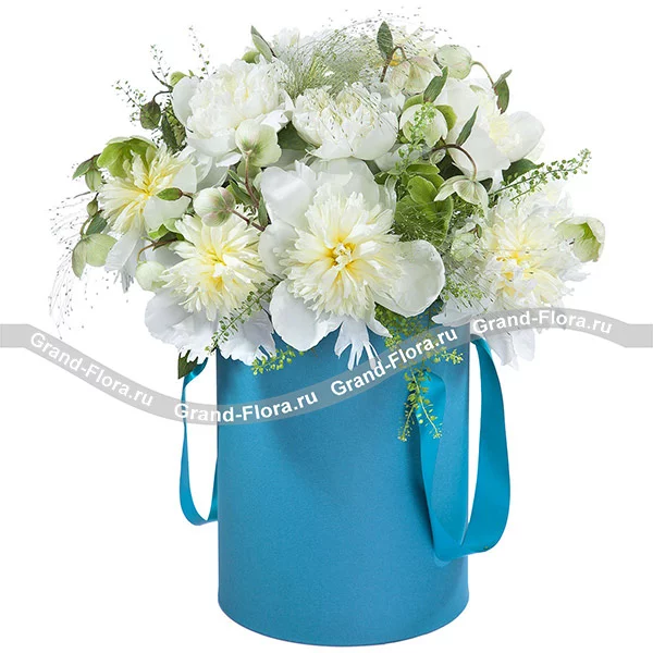 Стандартный: пион белый - 15 шт., декоративная зелень, оазис, коробка.