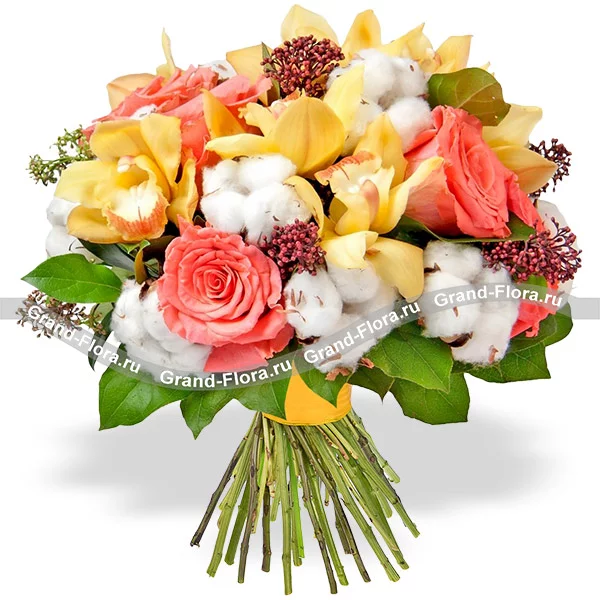 Стандартный(на фото): роза коралловая - 5 шт.,орхидея желтая - 7 шт., декоративная зелень, хлопок - 7 шт., лента.