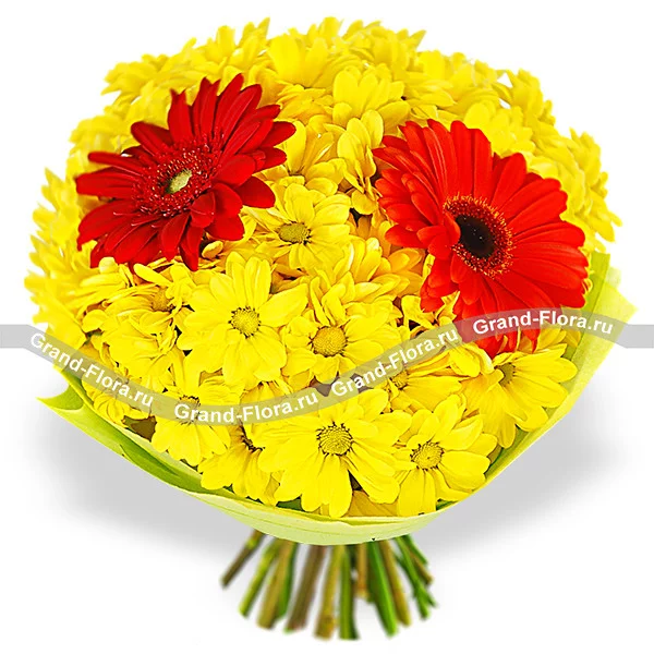 Яркий букет, в центр которого помещена пара огненных гербер, завершает солнечная кустовая хризантема. Такое сочетание цветов вмиг поднимет настроение его получателю. Игривая композиция поможет выразить глубокое чувство привязанности и любви, а также станет великолепным вариантом в качестве подарка значимой женщине в день ее рождения. Ваша мама наверняка запомнит столь очаровательную композицию, а девушка моментально забудет все обиды.
